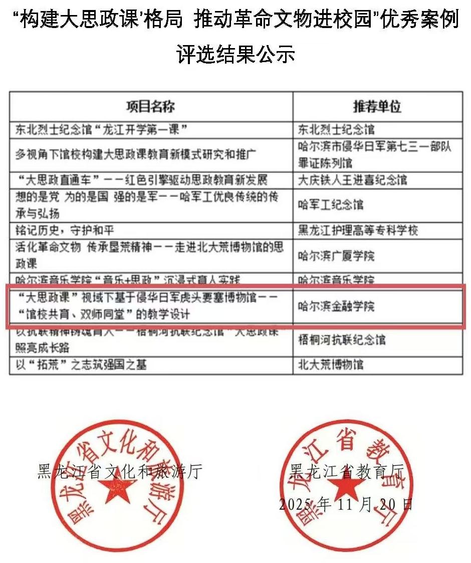 近日,黑龙江省文化和旅游厅与教育厅联合公布了“构建‘大思政课’格局 推动革命文物进校园”优秀案例评选结果。我校马克思主义学院教师董秀玲申报的《“大思政课”视域下基于侵华日军虎头要塞博物馆——“馆校共育、双师同堂”的教学设计》,凭借其独特的育人理念与新颖的设计思路,在全省众多案例中脱颖而出,荣获“优秀案例”。
