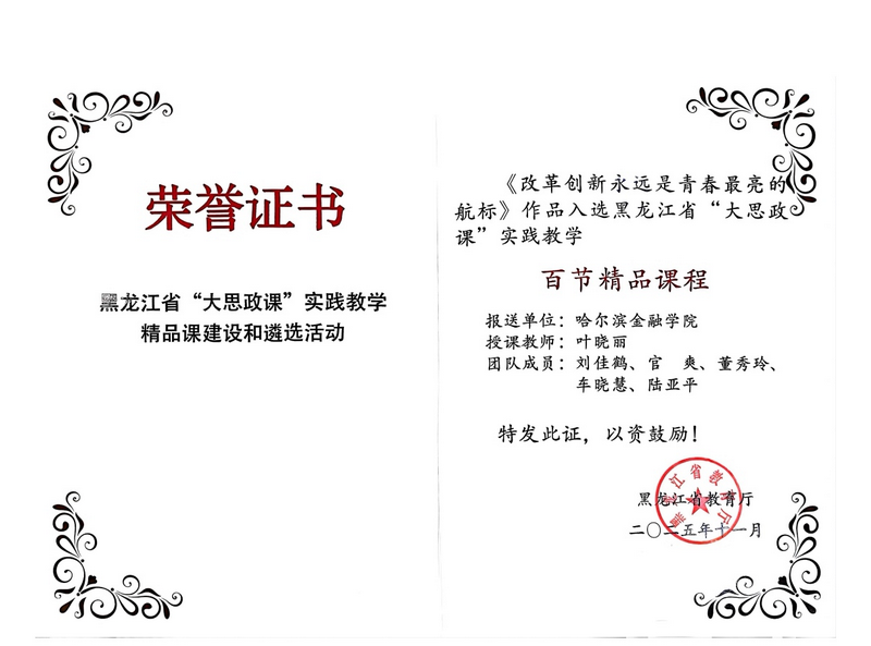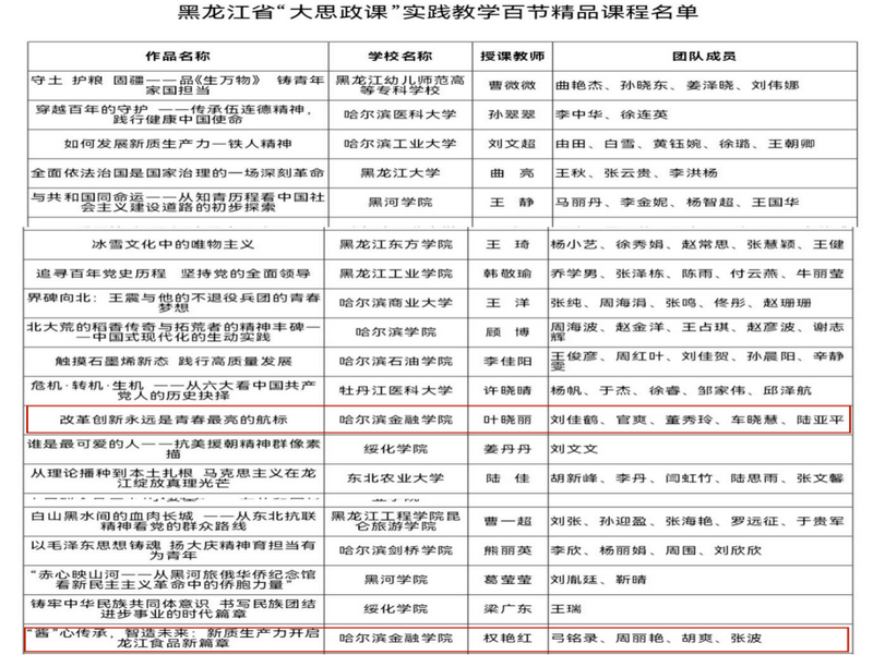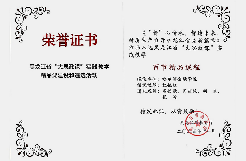 近日,黑龙江省教育厅公布了省级“大思政课”实践教学精品课程遴选结果。我校马克思主义学院叶晓丽教师团队报送的《改革创新永远是青春最亮的航标》,以及权艳红教师团队报送的《“酱”心传承,智造未来——新质生产力开启龙江食品新篇章》,经激烈角逐,成功入选省级“大思政课”实践教学百节精品课程。此次入选,彰显了我校在思政教育领域长期积淀的扎实功底,也体现了在“大思政课”实践教学模式上的创新突破。