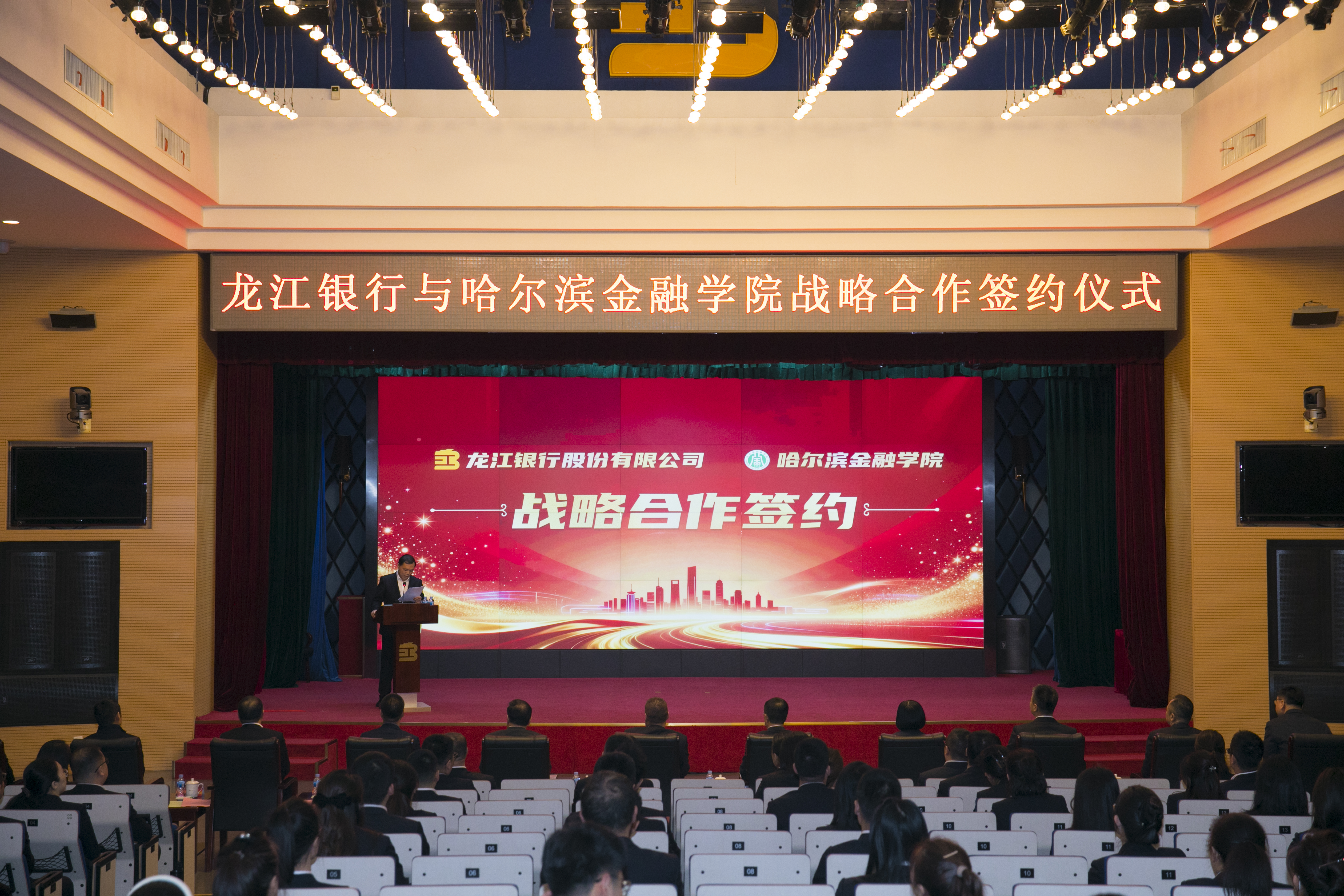 12月10日,哈尔滨金融学院与龙江银行股份有限公司战略合作协议签约仪式在龙江银行总行举行。哈尔滨金融学院党委书记杨弘宇,校长、党委副书记张林,党委副书记、工会主席黄强,副校长武建龙,龙江银行党委书记、董事长姜春洁,副行长陈浩,董事会秘书赵胜宾,行长助理高东明,首席信息官那群威等领导出席仪式,双方相关业务部门负责人参加会议。仪式由龙江银行行长助理高东明主持。
