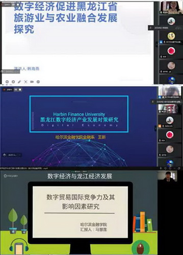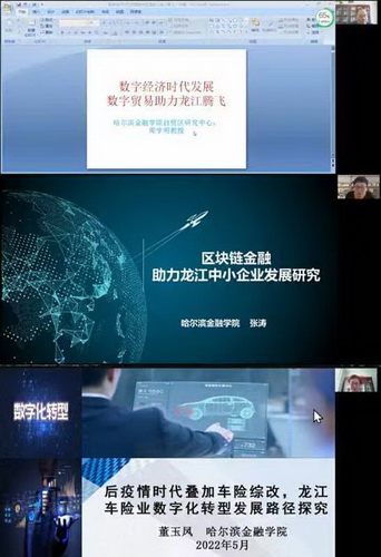 论坛中,金融系副主任张涛教授、周学明教授、王新副教授、马慧莲博士,投资保险系董玉凤副教授、韩海燕副教授从不同视角,就“区块链金融助力龙江中小企业发展”“数字经济时代发展数字贸易助力龙江腾飞”“黑龙江数字经济产业发展对策”“数字贸易国际竞争力及其影响因素”“后疫情时代叠加车险综改,龙江车险业数字化转型发展”“数字经济促进黑龙江省旅游业与农业融合发展”问题,同与会人员进行了分享交流。