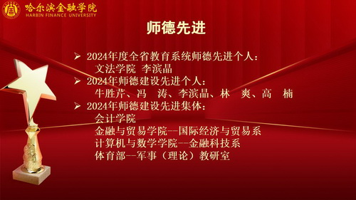 张林对全体教师提出四点希望。一要坚定理想信念,做学生成长的引路人。躬耕于三尺讲台,做学生成长成才的引路人。不断加强和改进新时代学校思想政治教育,教育引导青少年学生坚定马克思主义信仰、中国特色社会主义信念、中华民族伟大复兴信心,立报国强国大志向、做挺膺担当奋斗者。二要加强师德修养,做学生爱戴的好老师。要努力加强教师思想政治教育和师德师风建设,实施教育家精神铸魂强师行动,坚守职业道德,做到以德立身、以德立学、以德施教。关爱学生,尊重学生的个性差异,平等对待每一位学生,做学生的良师益友。严谨治学,树立终身学习的理念,不断提高教学水平和科研能力。三要勇于创新创造,做教育改革的推动者。学校将持续培养造就新时代高水平教师队伍,并将自身发展主动融入区域经济社会发展的大局,切实增强服务龙江高质量发展可持续振兴的政治自觉和历史主动,守正创新,改革赋能,狠抓学校第二次党代会擘画的目标任务和“十四五”规划落实,积极探索新时代教育教学方法,开展教育教学改革实践,加强科学研究,推进高水平教育开放,注重培养数智时代学生们的创新思维、实践能力,奋力书写好教育强省建设的“强师”答卷。四要强化责任担当,做学校发展的贡献者。当前,筹备审核评估、争取硕士学位授权立项建设单位、推进二级管理体制改革等工作任务依然繁重艰巨。这更需要广大教职员工树牢大局意识、责任意识,投身学校的改革建设和发展,构建好有利于教育高质量发展的体制机制。大家要以今天受到表彰的个人和集体为榜样,持续锤炼“扎扎实实、踏踏实实、求真务实”工作作风,立大志、做先锋、挑重担、建新功,为建设特色鲜明的高水平应用型财经大学,接稳、接好历史的接力棒。