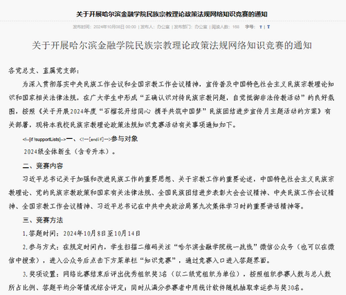 一是充分利用载体进行宣传。为加强师生对铸牢中华民族共同体意识的理解和认识,营造民族团结进步宣传氛围,各学院通过微信公众号、悬挂宣传标语、民族团结进步教育宣传展板等方式,展示体现中华优秀传统文化、民族团结进步的内容,营造了民族团结进步浓厚氛围,让民族团结进步理念、中华民族共同体意识在潜移默化中浸润各族同学心灵。二是举办民族宗教理论政策法规网络知识竞赛。各学院党总支认真组织本单位新生踊跃参与,活动有序顺利地开展,并取得了良好的效果。全校参加知识竞赛新生人数共3150人,参与率达98.4%。进一步增强了校内各单位民族宗教工作的责任感和使命感,提高了广大同学对民族宗教的正确认识。三是积极组织推荐网络作品展播。马克思主义学院组织开展了以“铸牢中华民族共同体意识,从浴火危城到大中小学思政育人‘同心圆’”为主题的“大学生讲思政课”党的创新理论学习教育活动,拍摄视频浏览量千余次。各二级学院积极参与了“石榴花开红 同心共筑梦”网络作品展播主题活动,强化了学生对中华民族共同体意识的理解和认同,讲好金院民族团结进步故事,让中华民族共同体意识根植于每位学生心中。四是开展结对认亲活动。少数民族结对认亲活动是促进少数民族学生融入集体、增进民族团结的重要形式。管理学院以藏族和维吾尔族学生为主体开展了结对认亲活动,管理学院教师一对一与学生结成对子,帮扶少数民族学生在学习、生活等各方面遇到的困难,增进师生情感,让少数民族同学感受到关爱就在身边、关心就在眼前。
