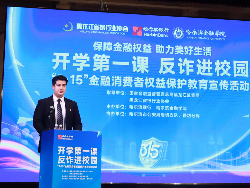 为进一步增强我校师生的金融安全意识,提升防范电信网络诈骗的能力,3月16日上午,由我校与哈尔滨银行共同主办的“开学第一课 反诈进校园”金融知识宣传活动暨“3·15”金融消费者权益保护教育宣传活动在金苑会堂成功举办,为近千名学生带来了一堂别开生面的“开学第一课”。校长张林、副校长黄强,黑龙江省银行业协会秘书长杜玉成、副秘书长王颖,哈尔滨银行党委专职副书记张玉峰,黑龙江省银行业协会自律部主任高轶、副主任胡杨,哈尔滨银行消费者权益保护与品牌宣传部总经理亓树新出席活动。