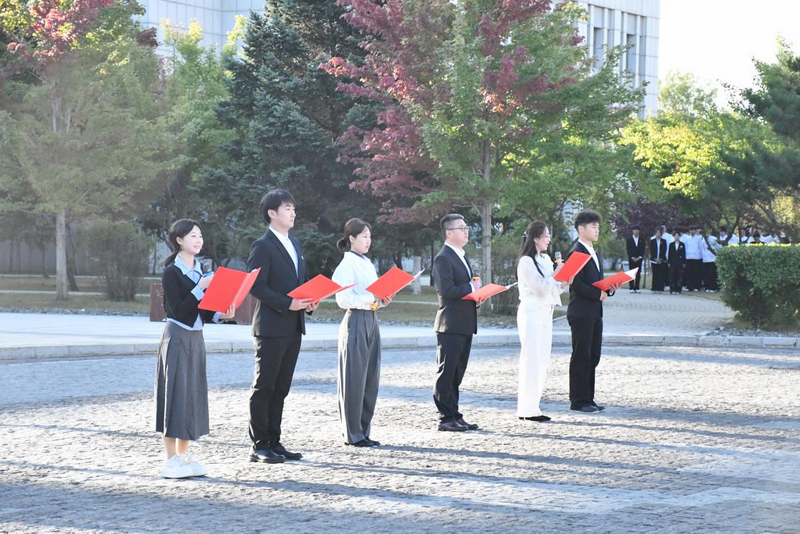 “五星红旗迎风飘扬,胜利歌声多么响亮……”全体师生齐声高唱《歌唱祖国》。这歌声,是金院人对祖国繁荣昌盛的真挚祝福,也是新时代青年为民族复兴接续奋斗的坚定誓言,是一种精神的传承,一种力量的汇聚,更是一种使命的交接。新程已启,未来可期!