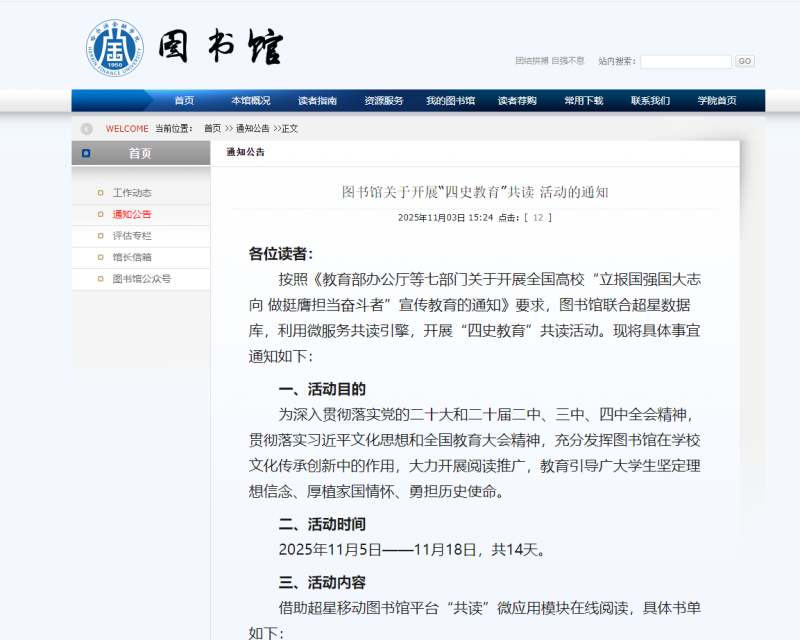 为深入贯彻落实党的二十届四中全会精神,贯彻落实习近平文化思想和全国教育大会精神,深化实施青春赓续中华文脉工程,学校“立报国强国大志向做挺膺担当奋斗者”宣传教育活动——“四史教育”馆藏书目推荐活动于11月4日在图书馆在二楼阳光大厅启动。