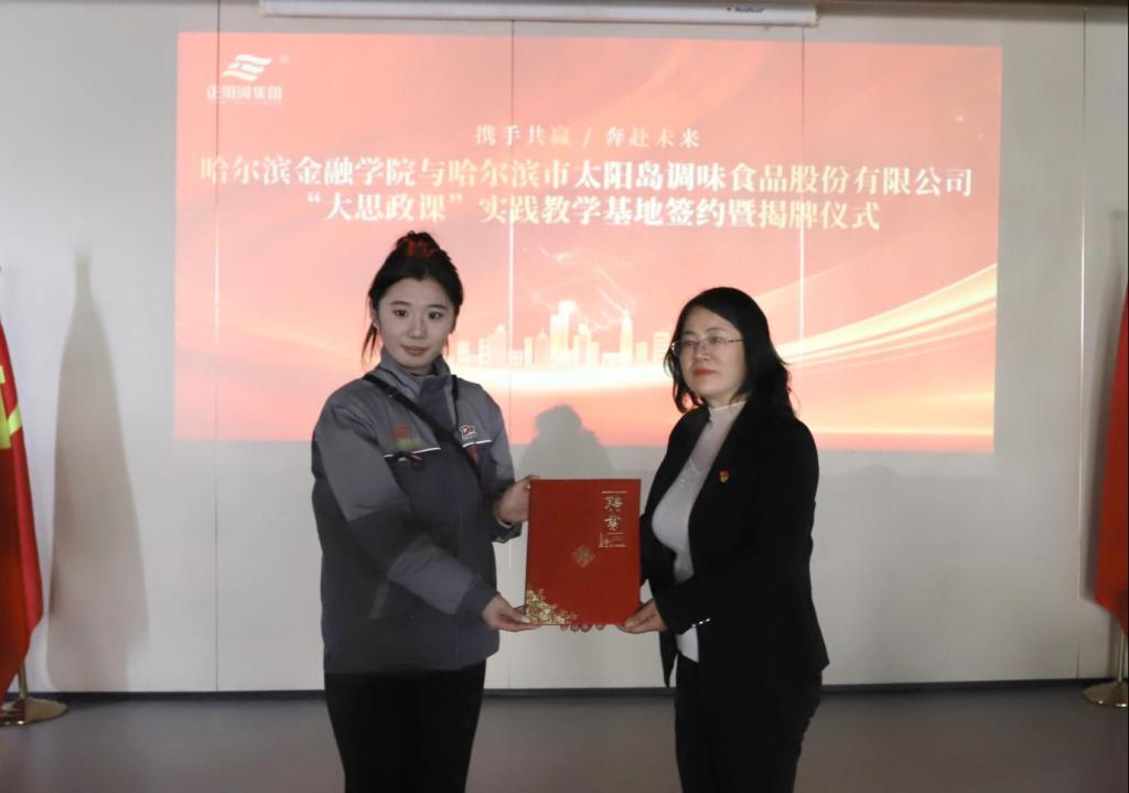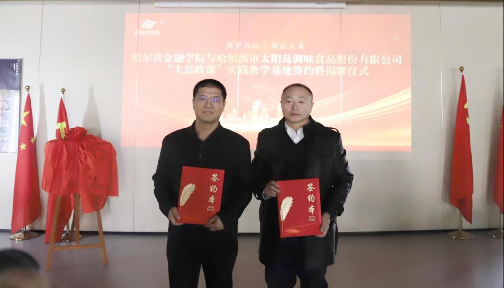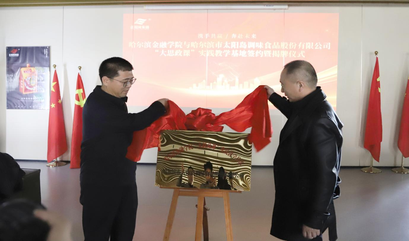 活动现场,哈尔滨金融学院副校长武建龙与哈尔滨市太阳岛调味食品股份有限公司董事长王玉鑫正式签署实践教学基地合作协议,并共同为基地揭牌。双方围绕思政课程共建、实践平台共享、人才联合培养等方面达成深度合作共识,明确将依托企业资源与学校教育优势,开发特色思政实践课程。