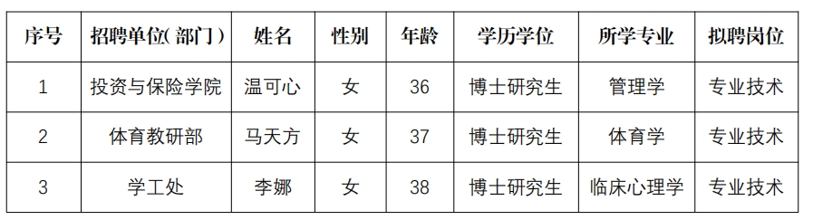 根据《黑龙江省省直事业单位公开招聘工作人员实施细则》(黑人社发〔2011〕68号)精神,按照《哈尔滨金融学院2024年博士招聘公告》相关要求,经2025年1月3日学校党委会审定,现将拟聘用人员名单予以公示。如对公示人员有异议,可在公示期内反映,反映情况和问题,必须实事求是,应签署或告知真实姓名、工作单位和联系方式;对线索不清的匿名信和匿名电话,公示期间不予受理。