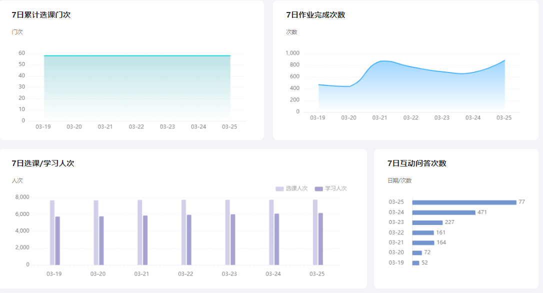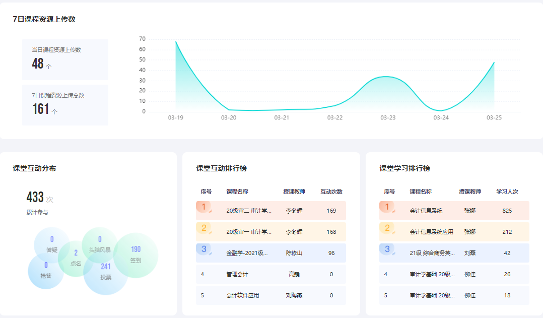 线上教学第二周进一步强化线上教学工作“督”和“导”,教务处协同智慧树平台上线“智慧树网督导功能”,使课程督导更便捷,充分发挥院系两级督导力量,深入课程教学一线了解课程具体开展情况;同时系部领导深入到学生班级中,及时发现并反馈线上教学存在的问题,提升线上教学质量监控的时效性和有效性。