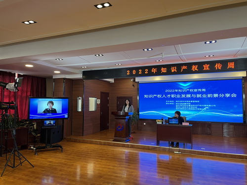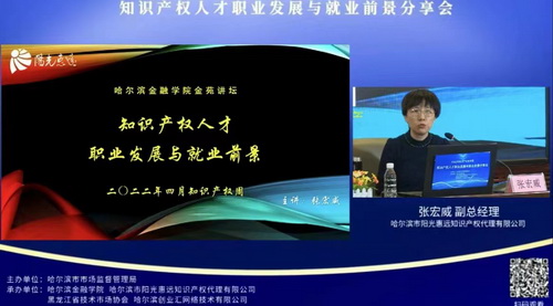 哈尔滨市阳光惠远知识产权代理有限公司副总经理张宏威女士进行了以“知识产权人才职业发展与就业前景”为主题的分享,从行业发展、国家发展规划、知识产权公司发展变化、市场需求等方面,结合自身的从业经历为同学们深入了解了知识产权行业。