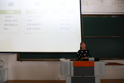 李蕾老师代表本系翻转课堂教学改革团队首先介绍了他们团队的翻转课堂教学改革经验,从翻转课堂教学改革的探索和实践两个方面就翻转教学模式如何选择平台和课程,如何运用平台资源以及什么课程和内容适合翻转进行了详细阐述,还对翻转课堂的教学设计、实施保障、教学过程、教学反思做了系统说明。孙玉秀老师介绍了关于《应用文写作》课程实施翻转式教学的心得体会,她以“颠覆传统 创新理念”为切入点,详细阐述了翻转的初衷和理念,以及翻转课堂成功的保证和良好的效果。