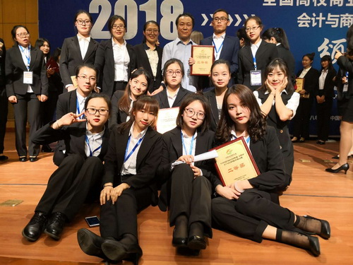本次大赛由中国国际商会商业行业商会与中国商业会计学会共同主办,中国国际商会商业行业商会与北京启课程科技有限公司承办。大赛旨在深化商科院校专业教学改革,提高大学生应用会计信息开展商业研究的能力,促进会计教育的互动与交流,推动以“会计服务”为代表的服务贸易的发展。此次竞赛分学生组和教师组,学生组参赛对象为学习会计学、财务管理等专业相关专业的全日制在校本科生或研究生,竞赛内容为设置案例进行分析。大赛分为在线知识竞赛、实践赛初赛、大陆地区选拔赛与总决赛大环节。由我院2015级会计学、审计学专业同学组成的“Advancer”、“To New For Win”与“微草”三支参赛团队经过在线知识竞赛、实践赛初赛的拼搏杀入总决赛,并且在总决赛中表现稳健,以其扎实商业计划书制作水平、临场沉着演绎和稳定应辩,三支学生代表队均获得国家二等奖的好成绩。