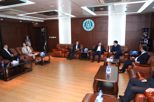 典礼开始前,刘小辉与来宾在图书馆会客室亲切交流,共同探讨以大赛为载体,通过银校深度合作,创建创新创业平台的模式,实现专业与产业共同发展,培养创新型人才。