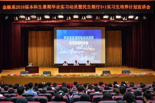 2018年6月20日金融系在金苑会堂组织召开了2019届本科毕业生暑期中国工商银行、中国建设银行实习动员会暨民生银行“3+1”实习生培养计划项目宣讲会,王新来对项目进行了宣讲,金融系585名2019届本科学生参加。