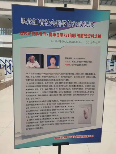 黑龙江省社会科学优秀成果奖由省委、省政府批准设立,是全省社会科学研究领域的最高奖。多年来,为推动社会科学事业繁荣、促进经济社会发展作出了重要贡献。第十八届社科奖共评选优秀成果565项,获奖成果涵盖人文社科类大部分学科,特别是马克思主义哲学、俄语语言文学、农林经济管理、东北地方史等我省优势特色学科。此次共展出展板60余块,遴选了部分一、二等获奖成果。我院教师周丽艳的《近代史资料专刊:侵华日军731部队细菌战资料选编》编译著获得优秀成果二等奖,并在此次展览中展出。
