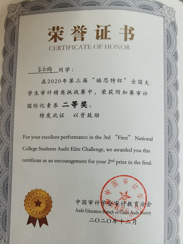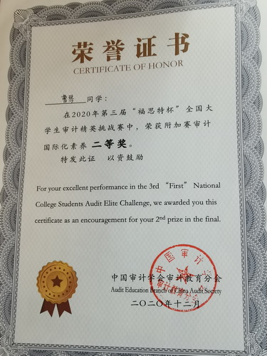 由中国审计学会审计教育分会主办,南京审计大学承办,广州市福思特科技有限公司提供技术支持的第三届“福思特杯”全国大学生审计精英挑战赛于近期落下帷幕。经过激烈的角逐,来自我校会计系曹琴、高爽、王云烨组成的代表队在比赛中获得审计核心技能赛项本科组二等奖和审计国际化素养赛项二等奖。林丽、渠帅老师获得优秀指导教师奖。