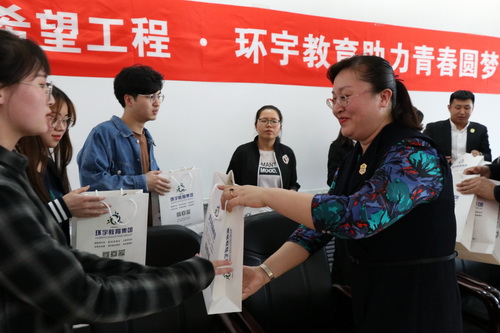 环宇教育集团校长谢丽茹为奖学金获得者发放纪念品