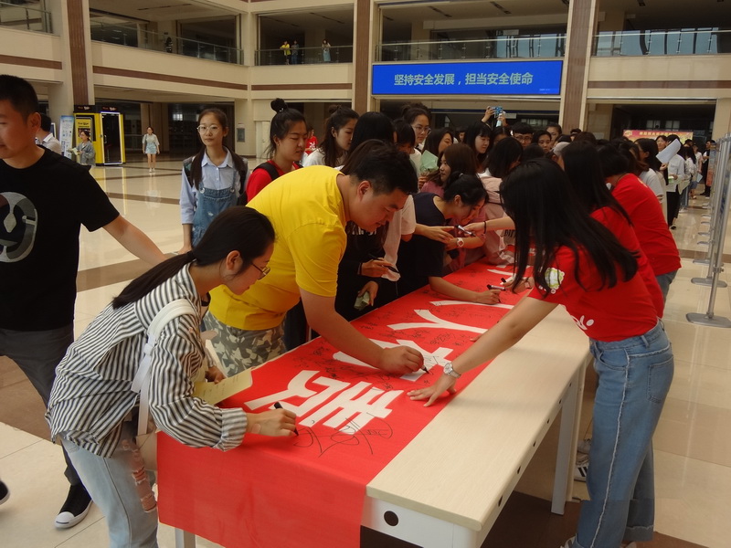 参加活动的各位领导、老师和同学们首先在“安全生产、人人有责”的标语上进行了签名。随后,参观了以“生命至上、安全发展”为主题的展示板。最后,学院领导来到咨询台前与咨询干警进行亲切交流和咨询,就如何开展好安全工作进行了深入探讨,同时对公安消防干警在百忙当中来到现场助力我院安全工作的开展表示了感谢。