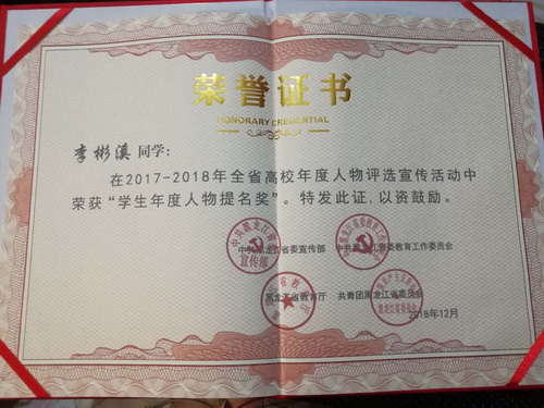 我院李彬溪同学荣获全省高校2017-2018学生年度人物提名奖