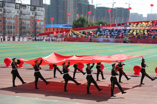 嘹亮的国歌、悠扬的校歌分别奏响,全场师生员工庄严站立,注目着鲜艳的五星红旗、校旗冉冉升起、迎风飘扬。