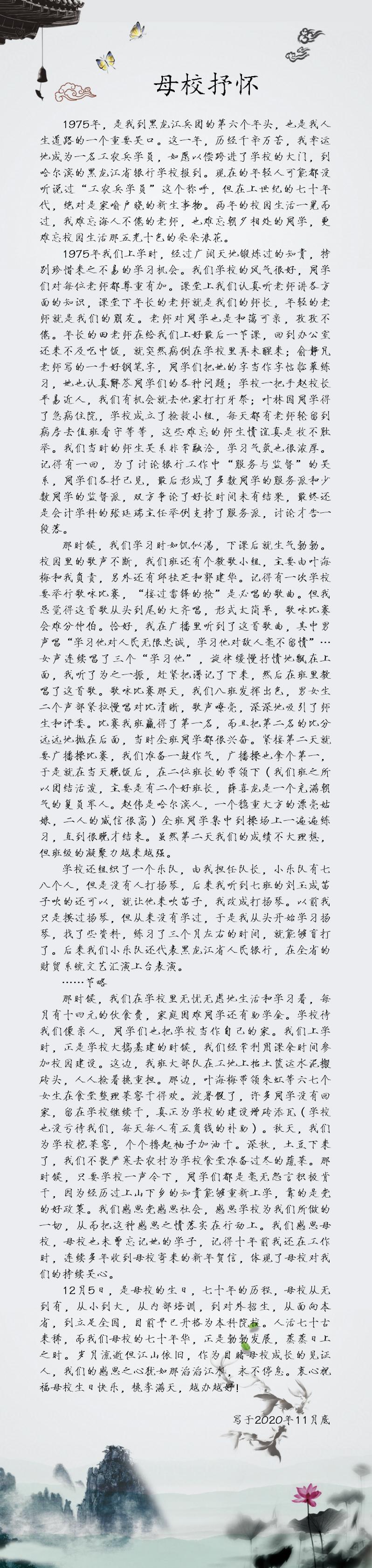 七秩风华铿锵壮语,诚礼育人桃李芬芳。沈卫东校友,杭州知青,是我校黑龙江银行学校时期1975级学生,1977年8月毕业。毕业后,任职于大庆市人民银行会计科,1992年9月调往中国银行浙江省分行财会处。2005年任浙江五洲科技有限公司财务总监、总经理,2017年光荣退休。沈卫东校友虽然已经毕业四十余年,但是无论身在黑土地,还是之江边,一直心系母校发展,厚植母校情怀,感念母校在新中国金融高等教育事业和区域经济社会发展中,写下了浓墨重彩的一笔。在母校七十华诞之际捐赠了珍贵的入学报到证,写下母校抒怀,衷心祝福母校生日快乐,越办越好!