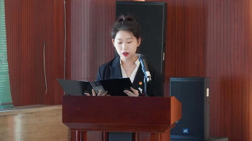 商务英语系学生代表陈薪羽代表全体参会学生代表致辞,预祝大会圆满成功,并号召全院青年学生与祖国同行、为人民奉献,以青春梦想和实际行动为实现中国梦贡献青春力量、书写无愧于时代的壮丽青春诗篇。