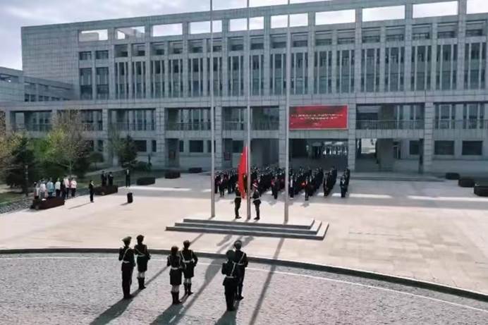伴着熹微晨光,随着音乐声响起,国旗护卫队气宇轩昂,迈着铿锵的步伐护送国旗到达升旗台。在激昂的国歌声中,国旗迎风招展,冉冉升起,全体师生庄严肃穆,面向国旗行注目礼。