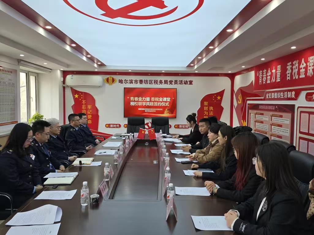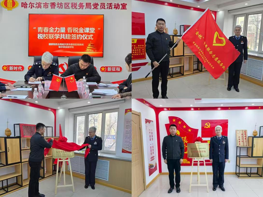 为深入贯彻落实党的二十届三中全会精神,深刻把握雷锋精神时代内涵,强化校地联动,3月4日我校与香坊区税务局举办“青春金力量 乡税金课堂”税校联学共建签约仪式。哈尔滨市香坊区税务局党委书记、局长杨英飞一行、哈尔滨金融学院团委书记门晓宇及相关负责同志,部分学生代表参加活动。