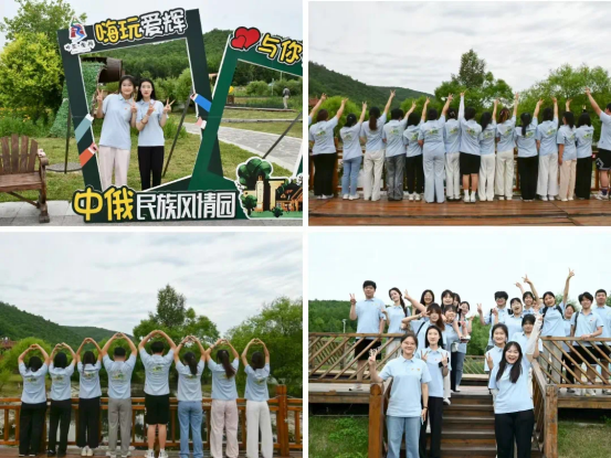 7月5日,"薪火弘金"实践团抵达黑河市中俄民族风情园。在呐喊喷泉前,团队成员以声浪激荡水花,体验呐喊的激情。俄罗斯姑娘带来的经典民族舞《卡林卡》点燃全场,随着欢快的节奏,她们飞扬的裙摆成为生动注脚。中俄青年并肩而立合影,将"青春无国界"的温暖瞬间永久定格。随后,实践团踏入鄂伦春风景区,感受鄂伦春族历史文化的精巧与民族歌舞的热情,领略多元文化的独特魅力。