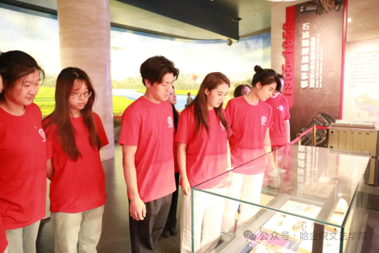 7月2日,实践团抵达大庆石油科技馆。这座以中国石油徽标“宝石花”为造型的宏伟建筑,以其独特的外观和深厚的文化底蕴,给实践团师生留下了深刻的第一印象。进入科技馆大厅,脚下镶嵌的“宝石花”造型的大庆油田地图,仿佛开启了时光之门,将大家带入石油铸就的工业史诗篇章。在参观过程中,实践团先后走进历程厅、科普厅。展厅内陈列的文物、逼真的地质构造模型、厚重的勘探复原场景以及展现石油勘探开发尖端技术的装置,让书本上的历史变得鲜活可感。模拟大庆长垣主力油田投产的壮观场面和橱窗中重现的石油会战场景,更是让师生们驻足良久。科技馆工作人员的专业详尽讲解,不仅让师生们了解了油田科技发展的“硬实力”,更深刻体悟到以铁人精神为代表的大庆精神作为强大的“软实力”,在驱动科技创新、支撑国家能源安全、推进中国式现代化进程中展现出的永恒魅力和时代价值。