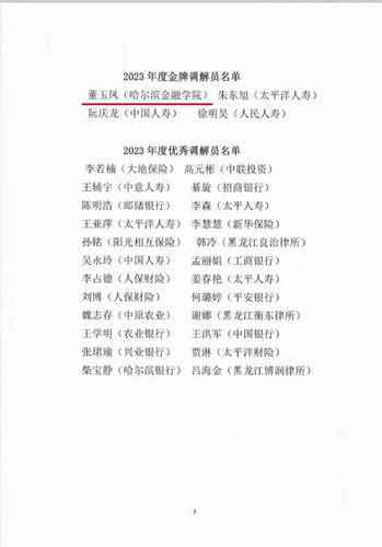 近日,黑龙江省银行保险业争议调解中心发布《黑龙江省银行保险业争议调解中心关于表彰2023年度优秀调解员的通报》,我校金融仲裁理论与实务研究中心主任(省司法厅与我校共建)、投资保险系教师董玉凤获评黑龙江省银行保险业争议调解中心金牌调解员。