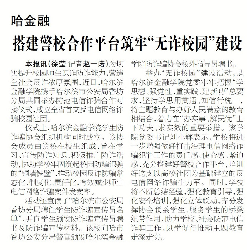 《黑龙江日报》刊登我校警校联合防范电信诈骗合作对接仪式