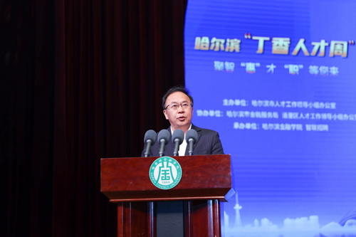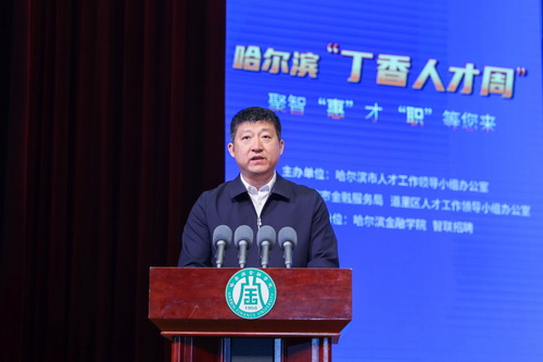 张林致欢迎辞。他向来宾和同学们介绍了我校的历史沿革、办学规模、学科建设、师资队伍、服务社会等基本情况。他指出,学校高度注重学生的思想价值引领,着力打造鲜明的金融特色,不断提升学生创新能力、应用能力、数字化能力培养,实现数字赋能,深化产教融合,努力建设“七个金院”。近年来,学校人才培养质量、学生综合素质得到了全面提升,毕业生到金融业就业优势突出,各项事业取得了历史性成就。他希望通过人才周专场活动,能有更多的金院优秀毕业生留在龙江、留在哈尔滨、留在道里,为龙江经济发展、为金融产业振兴贡献自己的全部力量,并祝愿“丁香人才周”活动取得圆满成功